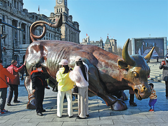 Des visiteurs touchent une sculpture de taureau en espérant un meilleur marché pendant les vacances de la Fête du Printemps à Shanghai (est de la Chine) le 16 février 2021. (Photo / China Daily)
