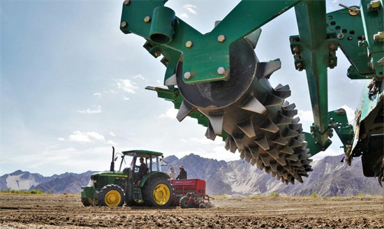 Des villageois sèment des graines d'orge du Tibet dans les champs avec des machines agricoles dans le village de Chabalang du comté de Quxu, à Lhassa, capitale de la région autonome du Tibet (sud-ouest de la Chine), le 22 avril 2020. (Purbu Zhaxi / Xinhua)