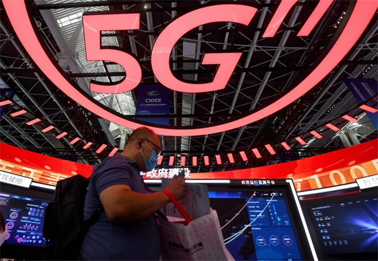 Un homme passe devant la zone d'exposition 5G de l'Exposition internationale de l'économie numérique de Chine 2021 à Shijiazhuang, dans la province chinoise du Hebei (nord), le 6 septembre 2021. (Wang Xiao / Xinhua)