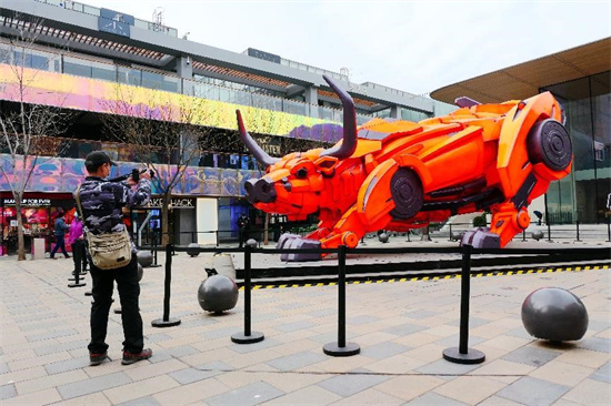 Le 21 février 2021, un visiteur regarde la statue de b?uf mécanique et prend la photo au quartier de Sanlitun à Beijing. (He Luqi / Pic.people.com.cn)