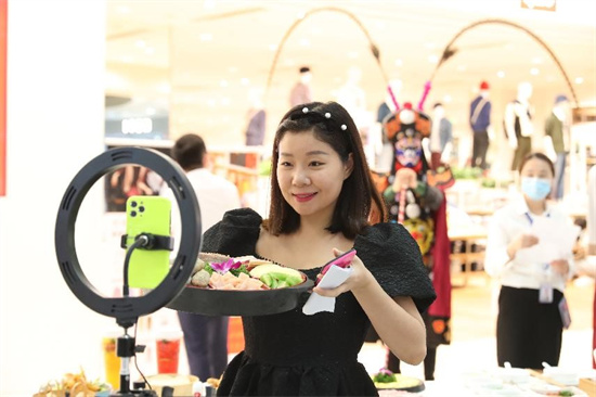 Le 17 ao?t 2021, sur la place Wanda de l'arrondissement de Shapingba de la municipalité de Chongqing, une vendeuse présente les plats du magasin sur le live streaming. (Sun Kaifang / Pic.people.com.cn)