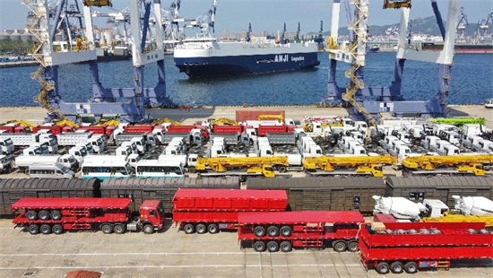 Le 31 octobre 2020, au quai du port de Lianyungang de la province du Jiangsu (dans l'est de la Chine), des équipements mécaniques fabriqués en Chine sont en attente d'expédition vers l'étranger. (Geng Yuhe / Pic.people.com.cn)