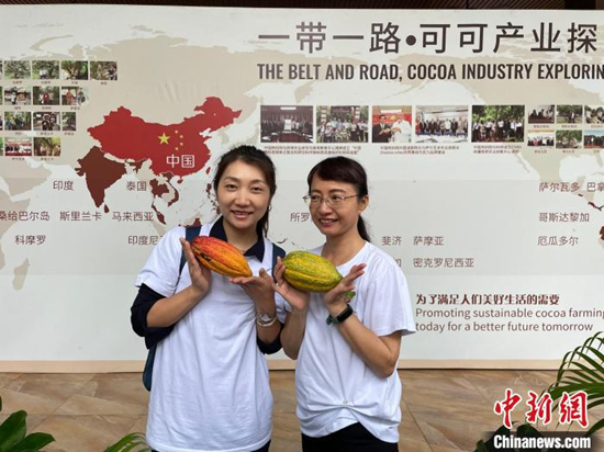 Des participants tiennent des cabosses de cacao dans leurs mains. (Huang Yi / China News Service)