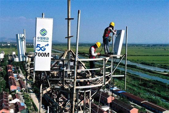 Le 16 septembre 2021, sur la tour d'une station de base de communication dans le bourg de Laozhou situé en banlieue de la ville de Tongling de la province de l'Anhui (dans l'est de la Chine), des travailleurs installent et règlent les antennes 5G. (Guo Shining/Pic.people.com.cn)