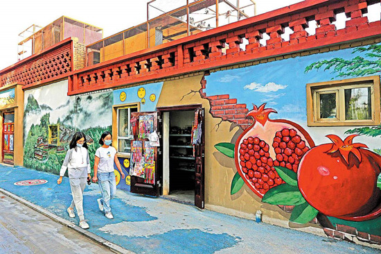 Des habitants passent devant une maison peinte dans le village de Xinchengximen, à Tourfan, dans la région autonome ou?ghoure du Xinjiang. (Cai Zengle / Chinadaily)