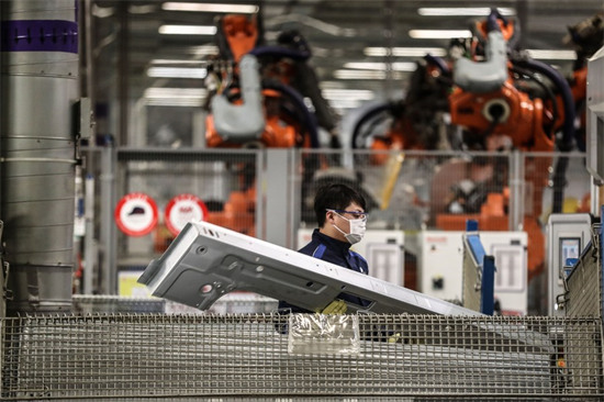 Un employé travaille à l'usine Tiexi de BMW Brilliance Automotive à Shenyang, chef-lieu de la province du Liaoning, en Chine, le 17 février 2020. (Pan Yulong/Xinhua)
