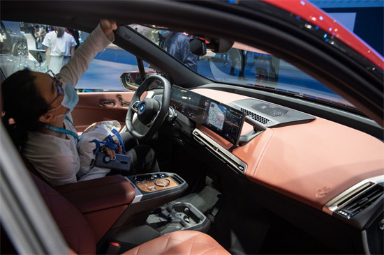 Une visiteuse examine l'intérieur d'une voiture BMW à énergie nouvelle lors de la 4e Exposition internationale d'importation de la Chine (CIIE) à Shanghai, en Chine, le 7 novembre 2021. (Meng Tao/Xinhua)