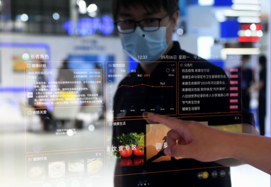 Un employé présente un miroir intelligent lors de l'Exposition internationale de l'économie numérique de Chine 2021, à Shijiazhuang, dans la province chinoise du Hebei (nord), le 7 septembre 2021. (Wang Xiao/Xinhua)
