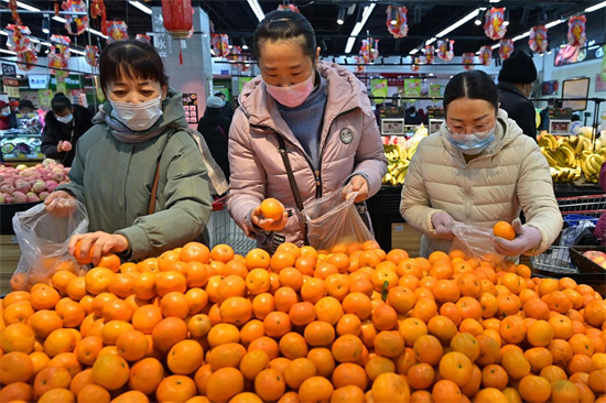 Le 12 janvier 2022, des consommateurs choisissent des fruits dans un supermarché dans la ville de Qingzhou de la province du Shandong (dans l'est de la Chine). (Wang Jilin/Pic.people.com.cn)