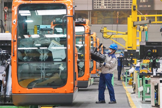 Le 17 janvier 2022, des ouvriers travaillent sur la ligne de production de la société Doosan Infracore (China) Co., Ltd. dans la zone de développement de la ville de Yantai de la province du Shandong (dans l'est de la Chine). (Tang Ke/Pic.people.com.cn)
