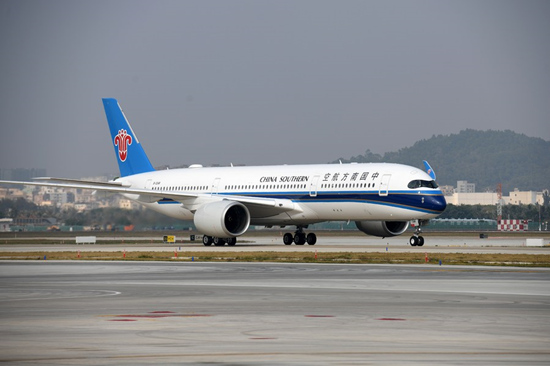 Un Airbus A350-900 arrive à l'Aéroport international Baoan, à Shenzhen, dans la province méridionale du Guangdong, le 6 janvier 2022. (Liang Xu/Xinhua)