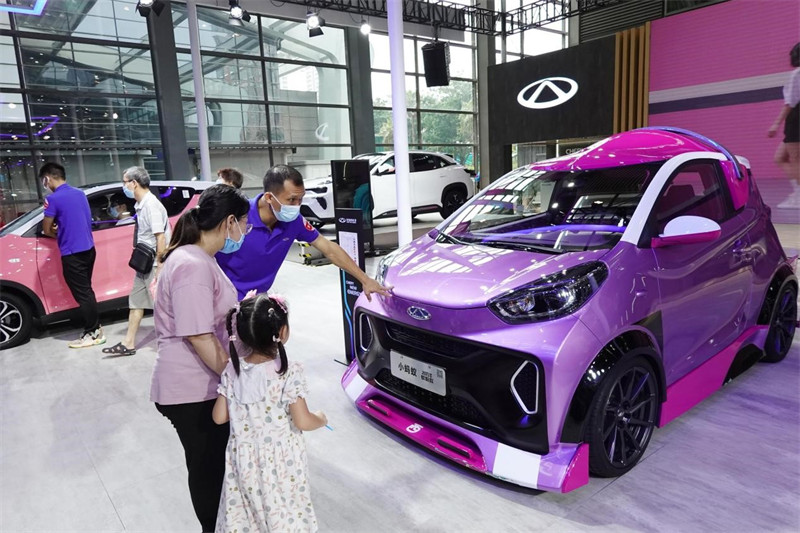 Des visiteurs découvrent des véhicules à énergies nouvelles lors de l'Exposition internationale de l'automobile de la région de la Grande Baie Guangdong-Hong Kong-Macao, le 24 juillet 2021. (Hu Zhizhi / Pic.people.com.cn)