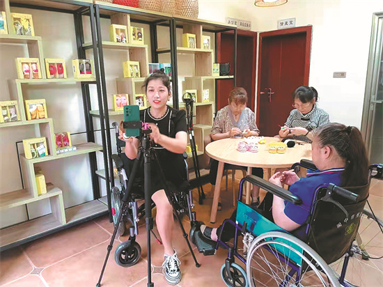 Des personnes handicapées participent à une diffusion en direct pour vendre leurs produits dans un centre de formation au tricot de la ville de Langzhong, dans la province du Sichuan (sud-ouest de la Chine). (Photo / China Daily)