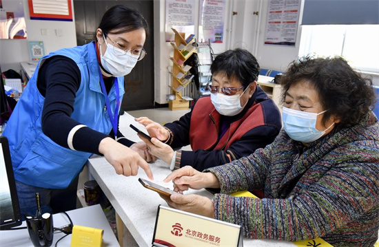 Une bénévole aide des personnes agées à utiliser une application de paiement en ligne dans une communauté de l'arrondissement de Fengtai, à Beijing, le 12 novembre 2021. (Li Xin/Xinhua)