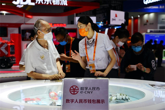 Des visiteurs visitent le stand de l'Institut de recherche sur la monnaie numérique de la Banque Populaire de Chine dans le parc Shougang, zone d'exposition de la Foire internationale du Commerce des Services de Chine 2021 (CIFTIS). (Du Jianbo / Pic.people.com.cn)