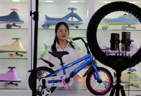 Le 21 avril 2022, une employée de la société Hebei Tieniu Bicycle Industry Co., Ltd présente des vélos pour enfant par le live-streaming lors de la Foire de Canton. La société se trouve dans le comté de Guangzong de la ville de Xingtai de la province du Hebei (dans le nord de la Chine). (Xang Lei / Pic.people.com.cn)