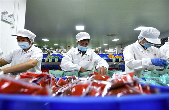 Des travailleuses emballent des nouilles Luosifen dans une société de transformation alimentaire à Liuzhou, dans la région autonome Zhuang du Guangxi (sud), le 23 novembre 2021. (Xinhua/Huang Xiaobang)