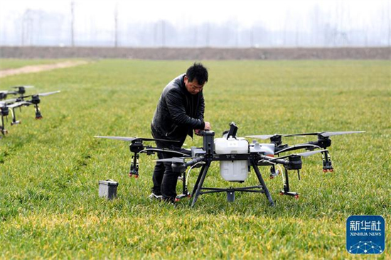 Dans un champ du district de Jiyang, à Jinan, capitale de la province du Shandong (est de la Chine), Gao Piquan, chef de la ferme familiale de Xusong du village de Zhanggao, s'occupe des cultures avec deux opérateurs de drones. Peu après, accompagnés d'un son bourdonnant, les drones ont répandu une brume dans l'air.