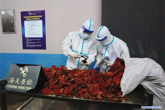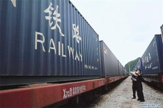 Des douaniers examinent un train chargé des plantes médicinales en provenance du Vietnam à Pingxiang, dans la région autonome Zhuang du Guangxi (sud), le 8 mai 2022. (Xinhua/Tang Renling)