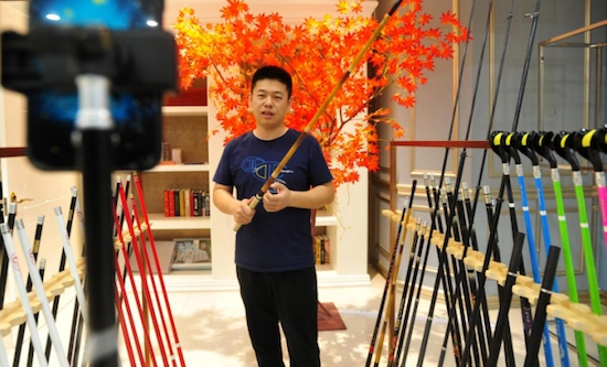 Le 6 juin 2020, un animateur vend des cannes à pêche sur une plateforme de livestreaming dans une base de fournitures de marchandises pour l'e-commerce dans le comté de Suning de la province du Hebei (dans le nord de la Chine). (Yuan Liwei/Pic.people.com.cn)