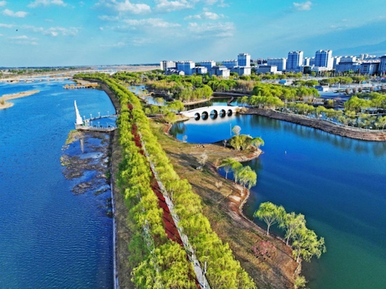 Le 17 avril 2022, la photo montre le paysage pittoresque d'un parc urbain de zones humides le long de la rivière Heihe au printemps dans le comté de Gaotai de la ville de Zhangye de la province du Gansu (dans le nord-ouest de la Chine). (Zheng Yaode/Pic.people.com.cn)