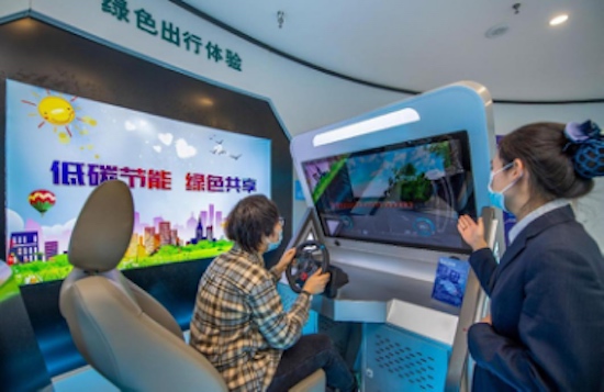 Le 24 février 2021, une personne conduit un simulateur de voiture à énergie nouvelle dans le centre d'expérience en matière d'électricité intelligente pour s'initier au déplacement vert et sobre en carbone dans la ville de Yuncheng de la province du Shanxi (dans le nord de la Chine). (Xun Jun / Pic.people.com.cn)