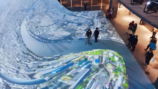 Le 23 février 2022, des gens visitent la maquette numérique 5D immersive dans le Centre d'exposition de la planification urbaine de Shanghai. (Chen Yuyu / Pic.people.com.cn)