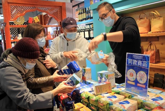 Le 8 novembre 2021, de nombreux touristes achètent les produits importés exposés lors de l'Exposition internationale d'importation de la Chine (CIIE) au marché de la CIIE sur la rue piétonne Nanjing à Shanghai. (Li Lizhen/Pic.people.com.cn)