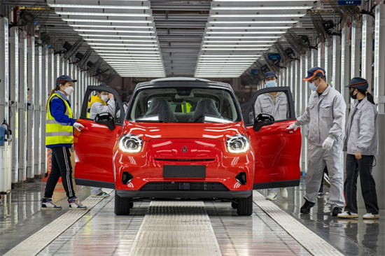 Des ouvriers travaillent dans un atelier d'assemblage final d'un constructeur automobile dans le bourg des véhicules à énergie nouvelle à Jinhua, ville de la province chinoise du Zhejiang (est), le 17 décembre 2021. (Xinhua/Hu Xiaofei)