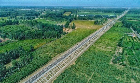50 millions de mètres carrés de grilles d'herbe ont été construits, et 13 millions d'arbustes et d'arbres ont été plantés pour former une barrière verte, afin de bloquer le sable et de protéger le chemin de fer. (Photo / China Railway Urumqi Bureau Group)