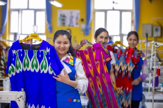 Le 20 avril 2022, des employés montrent les vêtements du style Adelais nouvellement cousus, dans l'usine de confection Hotan Ellenizier Handicraft Co., Ltd, dans le village d'Aoyila du canton de Qierbag, dans le comté de Luopu de la région autonome ou?ghoure du Xinjiang (nord-ouest de la Chine). (Maimaiti Elie Aniwal / Pic.people.com.cn)