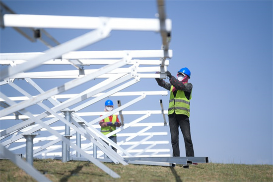 Des membres du personnel travaillent sur le chantier de construction d'un projet photovolta?que d'un million de kilowatts dans le district de Gonghe de la préfecture autonome tibétaine de Hainan, dans la province chinoise du Qinghai (nord-ouest), le 8 juin 2022. (Photo : Zhang Long)