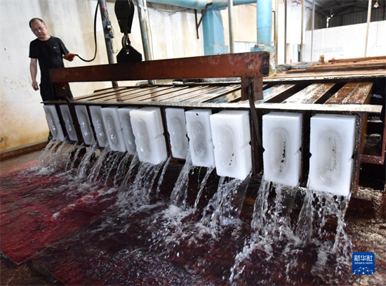 Un ouvrier déverse des gla?ons fabriqués hors des moules dans un atelier de fabrication de glace à Chaohu, dans la province de l'Anhui (est de la Chine), le 13 juillet. (Ma Fengcheng / Xinhua)