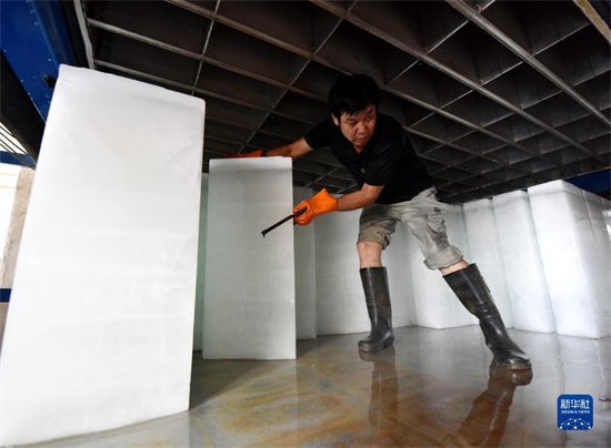 Un ouvrier transporte des gla?ons fabriqués dans un entrep?t frigorifique à Chaohu, dans la province de l'Anhui (est de la Chine), le 13 juillet. (Ma Fengcheng / Xinhua)