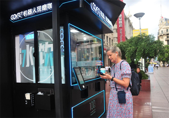 Le 12 ao?t 2021, un touriste étranger commande un café dans un kiosque automatique de café, qui est servi par un robot, dans la rue piétonne Nanjing à Shanghai. (Yang Jianzheng / Pic.people.com.cn)