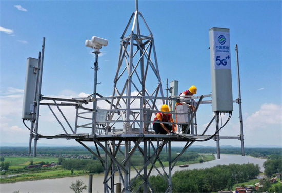 Le 8 juillet 2022, des personnels de la filiale de China Mobile ajustent des antennes sur une station de base 5G dans le canton de Xuba de l'arrondissement d'Yi'an de la ville de Tongling de la province de l'Anhui (dans l'est de la Chine). (Guo Shining/Pic.people.com.cn)