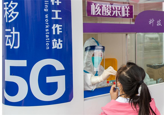 Le 16 mai 2022, dans le bourg de Jiangdong de l'arrondissement de Jindong de la ville de Jinhua de la province du Zhejiang (dans l'est de la Chine), des personnels médicaux effectuent des prélèvements pour les tests COVID-19. Grace à l'accès à Internet haut débit 5G, les personnels peuvent reconna?tre et enregistrer les informations sur la personne par un simple scan du QR code santé. Le processus prend une dizaine de secondes en tout, optimisant largement l'efficacité de prélèvement. (Yang Meiqing/Pic.people.com.cn)