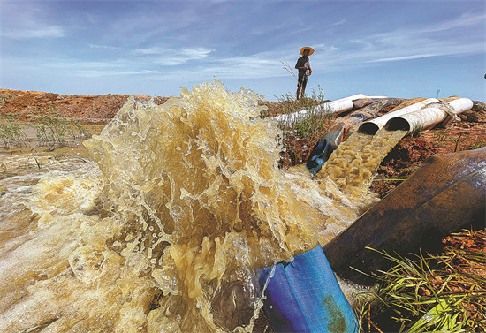 L'eau jaillit d'un système d'irrigation dans une rizière à Jiujiang, dans la province du Jiangxi (est de la Chine). Dans toute la Chine, face à des températures excessivement élevées, les gens atténuent l'impact de la sécheresse sur l'agriculture. (Photo / Xinhua)