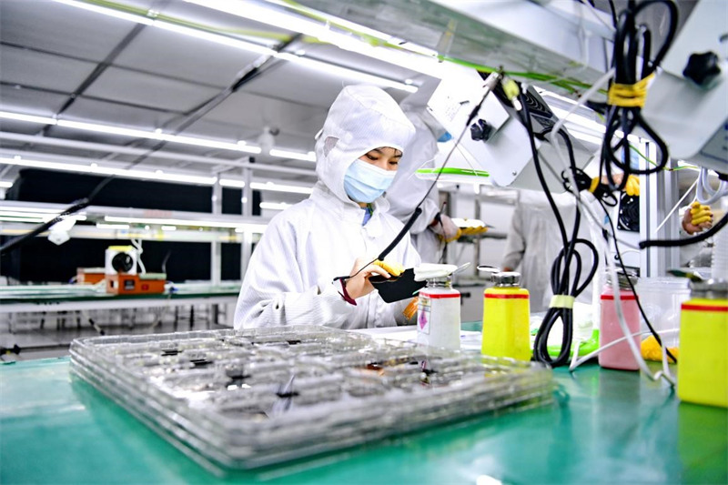 Le 13 mai 2022, des ouvriers d'une société de fabrication de produits électroniques produisent des écrans pour des portables 5G à exporter dans la zone sous douane complète de la zone de développement économique et technologique de Ganzhou dans la province du Jiangxi (dans l'est de la Chine). (Zhu Haipeng/Pic.people.com.cn)
