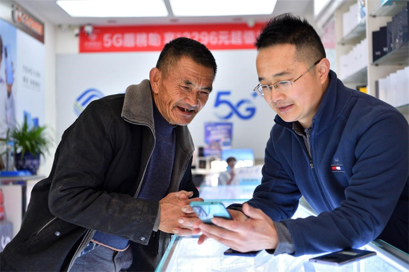 Le 12 novembre 2021, un homme achète un portable 5G dans un magasin du bourg de Maqiao du comté de Baokang de la ville de Xiangyang de la province du Hubei (dans le centre de la Chine). (Yang Tao/Pic.people.com.cn)