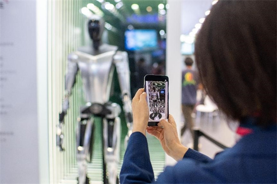 Des visiteurs prennent des photos de robots humano?des Tesla avec leurs téléphones portables sur le stand Tesla de la zone d'exposition des équipements techniques de la 5e Exposition internationale de l'importation de Chine (CIIE), le 5 novembre 2022. (Weng Qiyu / Le Quotidien du Peuple en ligne)
