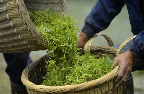 Des employés transfèrent des feuilles de thé de vigne dans le comté de Laifeng de la province du Hubei (centre de la Chine), le 23 mai 2018. Le thé de vigne de Laifeng, fabriqué à partir de feuilles de vigne d'ampelopsis, a été reconnu produit d'indication géographique nationale en 2013. (Song Wen / Xinhua)