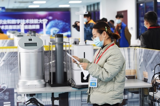 En novembre 2021, lors du concours national de nouvelles compétences professionnelles et numériques dans la province du Zhejiang (dans l'est de la Chine), des candidats participent au match de technicien pour robots de service dans l'école de techniciens mécaniques et électriques du Zhejiang. (Gong Xianming/Pic.people.com.cn)