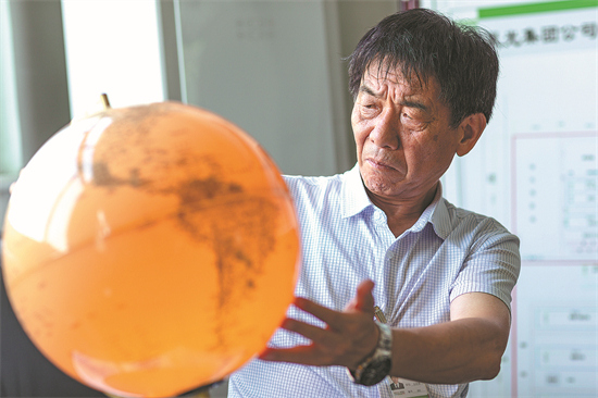 Lu Qingguo regarde un globe terrestre dans son bureau de Quzhou, dans la province du Hebei (nord de la Chine). (China Daily)