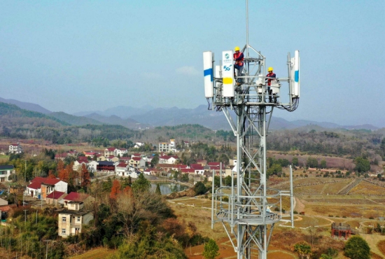 Des employés règlent l'antenne d'une station de base 5G dans le canton de Xuba de la ville de Tongling, dans la province de l'Anhui (est de la Chine). (Guo Shining / CFP)