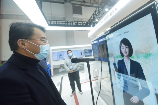 Le 12 décembre 2022, un visiteur interagit avec un personnage virtuel créé par l'intelligence artificielle lors de la première Exposition international du commerce numérique à Hangzhou de la province du Zhejiang (dans l'est de la Chine). (Long Wei/Pic.people.com.cn)