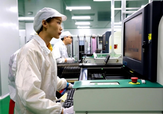 Le 31 mai 2022, des ouvriers fabriquent des composants et des terminaux de communication 5G dans l'usine numérique d'une entreprise technologique du comté de Quannan de la ville de Ganzhou de la province du Jiangxi (dans l'est de la Chine). (Yin Qiqi/Pic.people.com.cn)