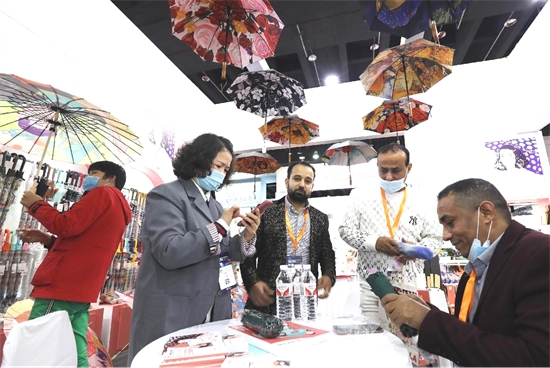 Des hommes d'affaires étrangers achètent des parapluies nouvellement sortis au Centre international des expositions d'Yiwu, le 24 novembre 2022. (Gong Xianming / Pic.people.com.cn)