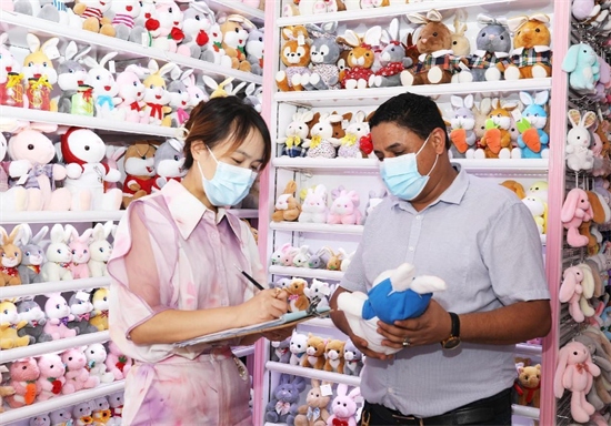Un homme d'affaires étranger achète des peluches à Cité internationale du commerce d'Yiwu, le 25 ao?t 2022. (Gong Xianming / Pic.people.com.cn)