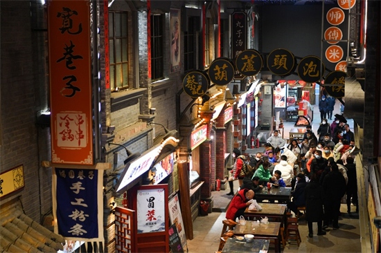 Des touristes dégustent des snacks locaux dans une rue commer?ante de Xianyang, dans la province du Shaanxi (nord-ouest de la Chine), le 24 janvier 2023 (Zhang Bowen / Xinhua)